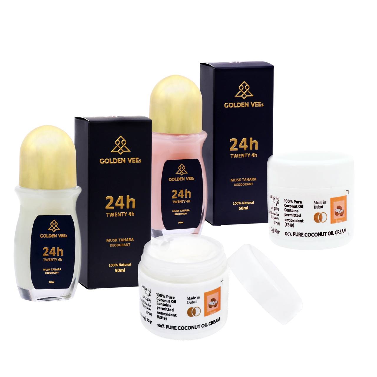Use the Golden VEEs anti-perspirant deodorant during the day and apply the natural coconut oil cream during the night for a new hygiene lifestyle. No more sweat odors!